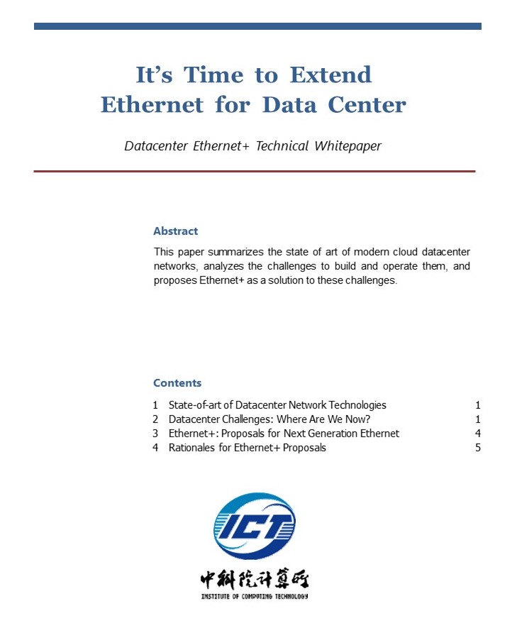 2016年6月19日,正值计算机体系结构领域的顶级国际学术会议ISCA(International Symposium on Computer Architecture)在韩国首尔召开期间, 中国科学院计算技术研究所发布了面向数据中心的新型以太网技术白皮书,计算所张立新研究员做了题为“Ethernet+: It’s Time to Extend Ethernet for Data Center"的报告,详细介绍了技术白皮书。该白皮书围绕当前以太网技术在“数据中心即计算机”场景中的挑战展开讨论,并对未来所期望的新型以太网技术做出了详细刻画。相比于传统的以太网技术,Ethernet+技术提出了智能区分服务的融合网络技术,从而可以在数据中心内实现对不同租户和应用的细粒度区分服务。另外,在兼容传统以太网技术的基础上,Ethernet+可以提供更高带宽、更低延迟和无丢包的网络服务,从而可以满足未来应用对更高网络性能的要求。