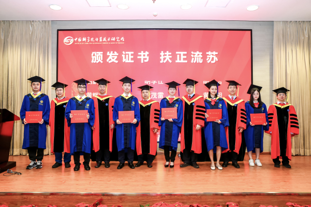 在庄严的乐曲中,毕业生依次上台,所领导、所学位委员会委员为毕业生扶正流苏、颁发学位证书并合影留念。