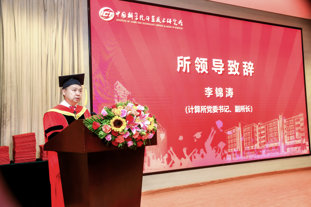 典礼在雄壮的国歌声中拉开帷幕。首先,计算所党委书记李锦涛热烈祝贺同学们顺利毕业,并向各位研究生老师及家长表示衷心的感谢。接着,他回顾了计算所发展历程,并从三个方面与同学们共勉。第一,责任,要牢记“科研为国分忧,创新与民造福”的计算所核心价值观,希望同学们能自觉把个人的理想追求融入到强化国家战略科技力量、实现自立自强的伟大事业中去,真正做到心系国家事,肩扛国家责,勇攀科技高峰,为推动国家发展作出重大贡献。第二,诚信,希望同学们珍惜自己的荣誉,诚信为本,踏实工作,诚实为人,坚定做一个引领诚信的时代新人。第三,创新,希望同学们在新的征途上继续保持和发扬计算所“创新求实,团结高效”的优良作风,在未来的工作学习中为国家作出富有创造性的杰出贡献。最后,他对同学们开始人生新的征程寄于祝福。
