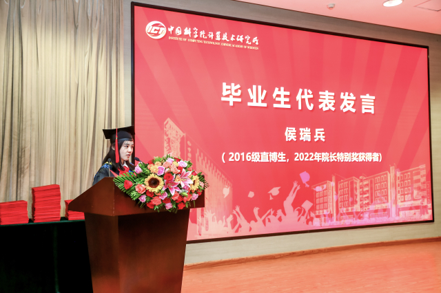 计算所2016级直博生、2022年院长特别奖获得者侯瑞兵代表全体毕业生发言。她首先对研究所、导师、家长和同学们表示感谢,然后分享了自己读博期间的学习生活和感受,最后希望和全体毕业生一起保持初心,砥砺奋进,在未来各自的岗位上发光发热。