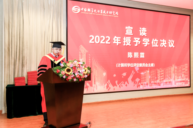 计算所学位评定委员会主席陈熙霖宣读了中国科学院大学2022年授予学位决议。