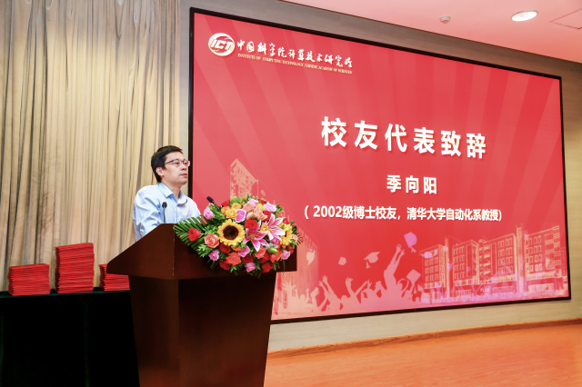计算所校友代表、清华大学自动化系教授季向阳先是表达了又回到计算所的激动之情,并祝贺各位同学们顺利毕业。然后他回顾了计算机的发展历史,并分享了自己的求学经验、科研经历和工作感悟。最后,希望计算所的发展越来越好,祝福同学们在即将踏上新的征程上“乘风破浪会有时,直挂云帆济沧海”。