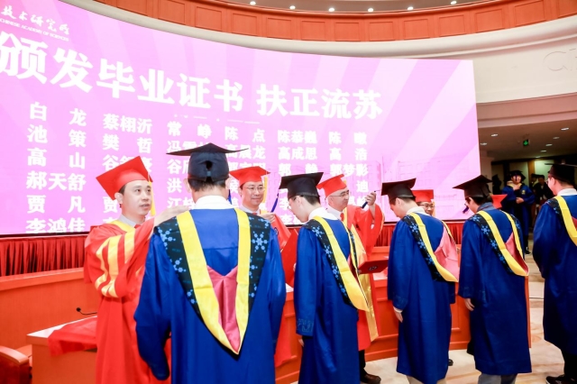 在随后举行的学位授予仪式上,计算所学位评定委员会主席包云岗副所长宣读了2023年学位授予决定。在激扬的乐曲声中和全场来宾的注目下,毕业生依次登台,接受学位委员颁发学位证书、扶正流苏,并合影留念。