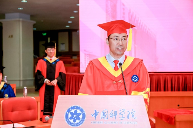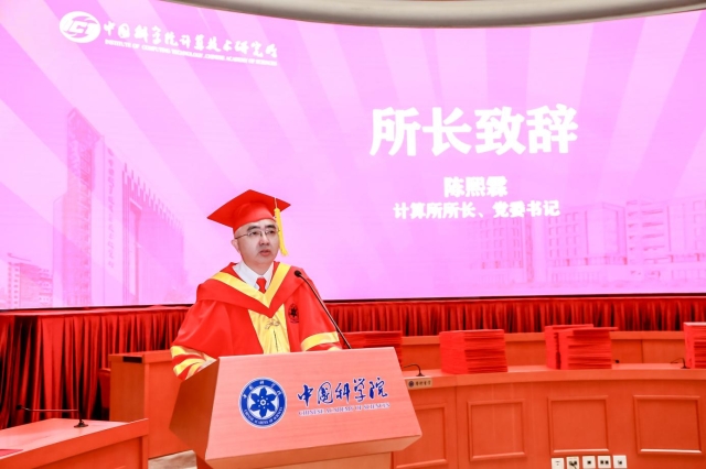 9点半,典礼在雄壮的国歌声中拉开帷幕。陈熙霖所长首先致辞。他对同学们经过数载寒暑、顺利毕业表示最热烈的祝贺。他希望同学们把毕业当作新阶段的开始,在未来的工作岗位上,牢记“科研为国分忧,创新与民造福”的初心使命;开启“无监督、自监督、多模态”的终身学习模式;善于合作与分享;保持正直与善良。他寄语同学们:道阻且长,行则将至,行而不辍,未来可期。