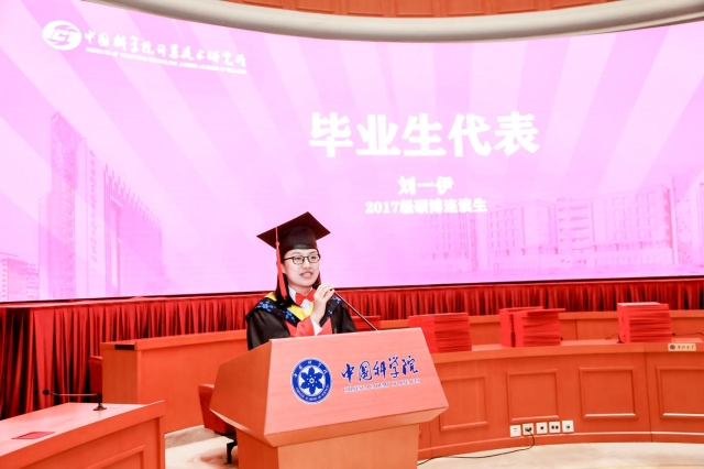 2017级硕博连读生刘一伊作为毕业生代表发言。她首先对传道解惑的师长和默默支持的家人表示由衷感谢。她表示毕业不是终点,今后当以更高的标准要求自己。最后,她与全体毕业生共勉:心怀山海,步履不停。