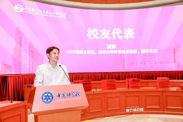 2007届博士、清华大学计算机系教授、副系主任刘洋作为校友代表发言。他结合求学和工作经历分享了两点感受:第一,做事坚持长期主义,切忌心浮气躁、急功近利;第二,要敢于梦想、勇于实践,突破能力边界,进入新的层次。他希望师弟师妹们作为中国计算机领域顶尖科研机构的毕业生,在波澜壮阔的大时代,应将个人命运与国家命运紧密相连,创造出无比光明的前途。