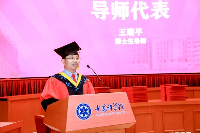 计算所所长奖教金获得者、博士生导师王瑞平作为导师代表发言。他代表全所导师向毕业生们表示热烈祝贺。他结合自身经历,为即将开启人生新征程的同学们提出三点期望:保持热情、拥抱变化和享受过程。他希望大家在职业发展中,能够立足长远,少一些个人得失的纠结,多一些团队荣誉的奉献,努力终会被发现,职业将会走的更长远。