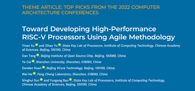 2023年1月,中国科学院计算技术研究所“香山”开源高性能处理器核团队论文《Towards Developing High Performance RISC-V Processors Using Agile Methodology》被评为2022年度IEEE Micro遴选的12篇精选论文(Top Picks)之一。近期,该论文的专刊版本在IEEE Micro期刊体系结构精选会议论文专刊(Top Picks from the 2022 Computer Architecture Conferences)正式发表,进一步介绍了“香山”开源项目的最新进展及其未来的潜在长期影响力。本次获评Top Picks奖项的论文最先发表于2022年第55届IEEE/ACM国际微架构研讨会(MICRO),主要介绍了团队围绕“香山”开源高性能RISC-V处理器核开展的处理器芯片敏捷开发研究工作。