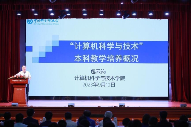 9月10日上午,中国科学院大学计算机科学与技术学院(以下简称“国科大计算机学院”)在中国科学院大学玉泉路校区大礼堂举行了2023级本科生 “开学第一课”。2020级至2023级共345位本科学生齐聚礼堂,正式开启新学期的学习。中国科学院计算技术研究所所长、国科大计算机学院 2023 级科学家班主任陈熙霖,国科大本科部部长燕敦验,中国科学院计算技术研究所副所长、国科大计算机学院副院长、本科拔尖基地负责人包云岗,国科大计算机学院副院长黄庆明,国科大计算机网安密码学院党委书记李剑,国科大本科部党总支部副书记王夺奎,中国科学院计算技术研究所教育处处长、国科大计算机学院科教融合办公室主任王元卓,中国计算机学会(以下简称“CCF”)会员与分部工委主任吴国斌,国科大计算机学院本科教学管理人员以及各年级班主任老师参加了此次活动。