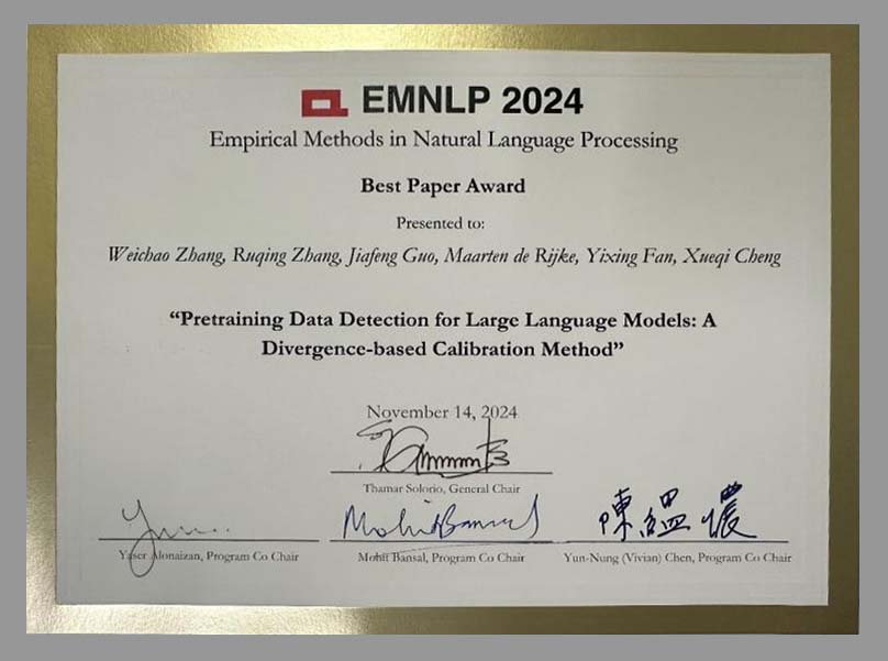 近日,智能算法安全重点实验室(中国科学院)博士生张伟超(导师:郭嘉丰研究员)为第一作者的论文Pretraining Data Detection for Large Language Models: A Divergence-based Calibration Method(大语言模型的预训练数据检测:基于散度的校准方法)获得EMNLP 2024大会最佳论文奖(Best Paper Award)。