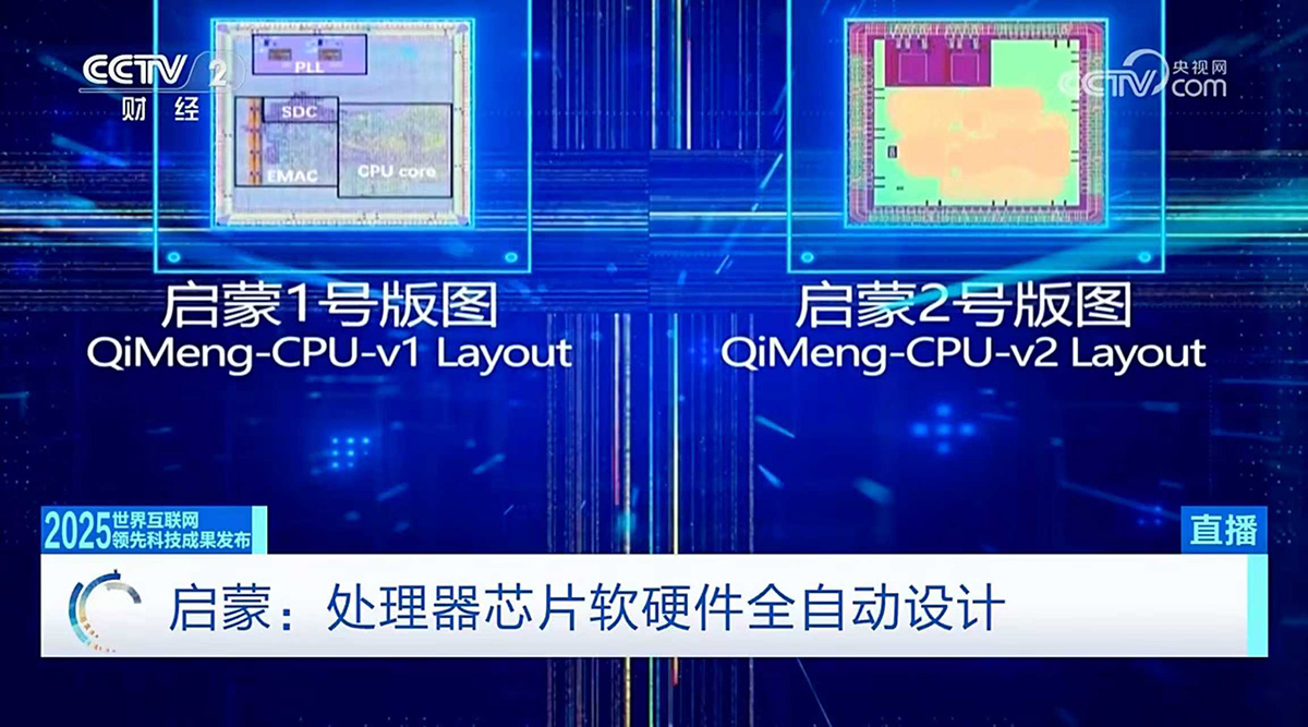 2025年世界互联网大会乌镇峰会于11月6日至9日在浙江乌镇举办。大会正式公布了国内外专家从互联网领域海量创新中评选出的17项“领先科技奖”获奖项目。由中国科学院计算技术研究所研发的“启蒙”处理器芯片软硬件全自动设计系统成功入选,与通义千问大模型、GLM大模型、GitHub Copilot编程智能体、银河通用具身智能大模型、忆阻器存算一体芯片、北斗三号卫星导航技术等前沿成果共同获奖。