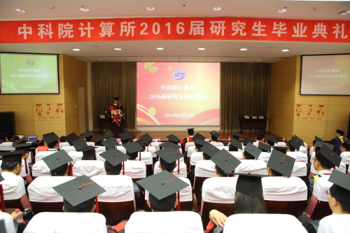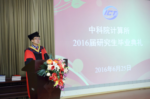6月25日上午,中科院计算所2016届研究生毕业典礼在计算所一层报告厅隆重举行。今年计算所共有229名研究生毕业,其中71名博士研究生,158名硕士研究生。所长孙凝晖、所学位评定委员会副主席李晓维、所学位评定委员会委员王兆其、委员卜东波、导师代表范东睿以及我所2004届毕业校友李晓东出席了典礼。典礼由教育处处长李琳主持。